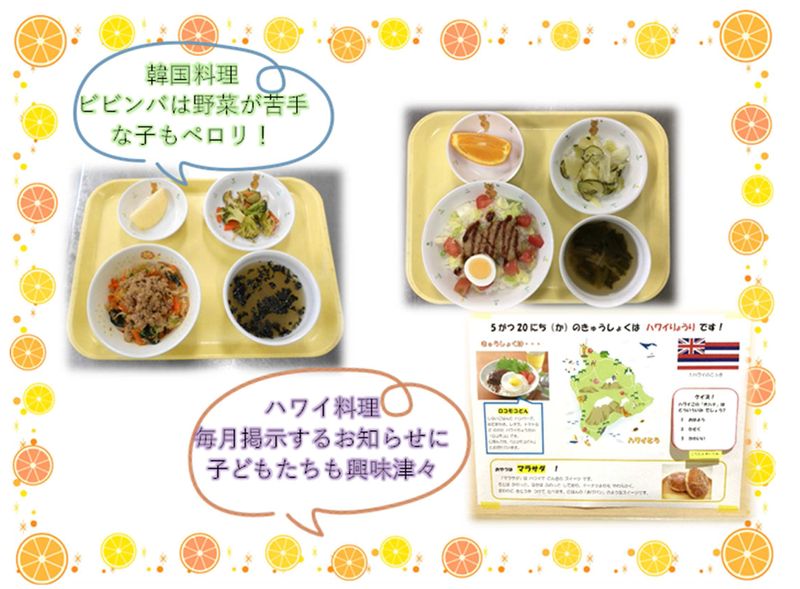 毎月1回、世界の料理や日本の郷土料理を提供しその国の食生活や文化を知る機会としています。「今日はどこの国?」「どんなごはん?」と子どもたちも毎月楽しみにしています!食を通じて色々な国の、色々な文化に興味を持ってもらいたいという願いがあります。